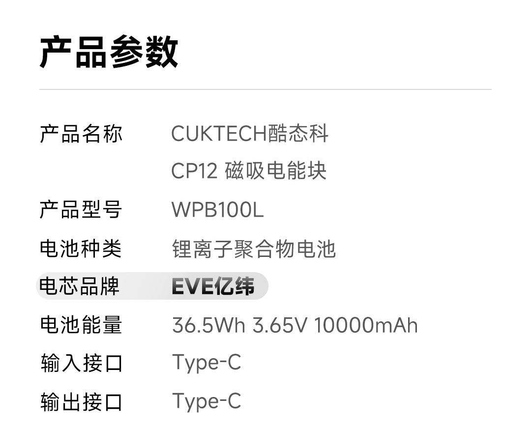CUKTECH酷态科磁吸电能块 WPB100L 星云灰
